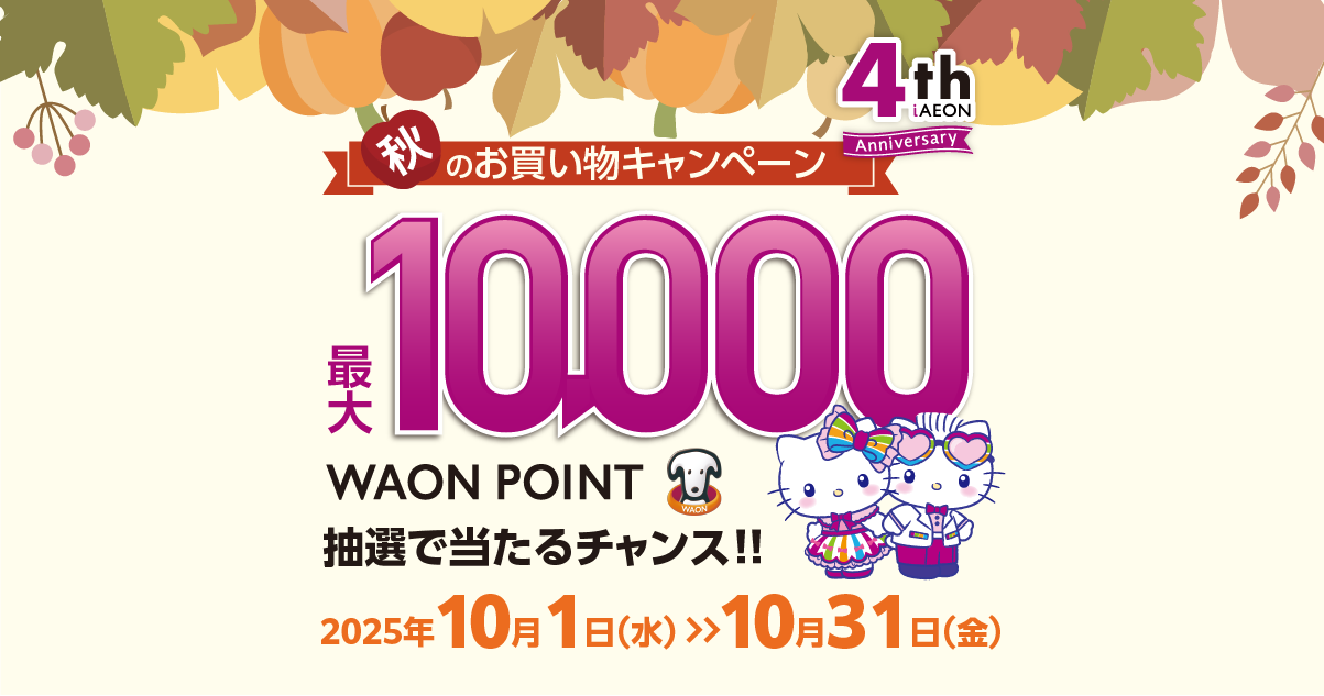 iAEON 秋のお買物キャンペーン!最大10,000WAON POINT♪他にも、iAEONハローキティコラボグッズがあたります!
