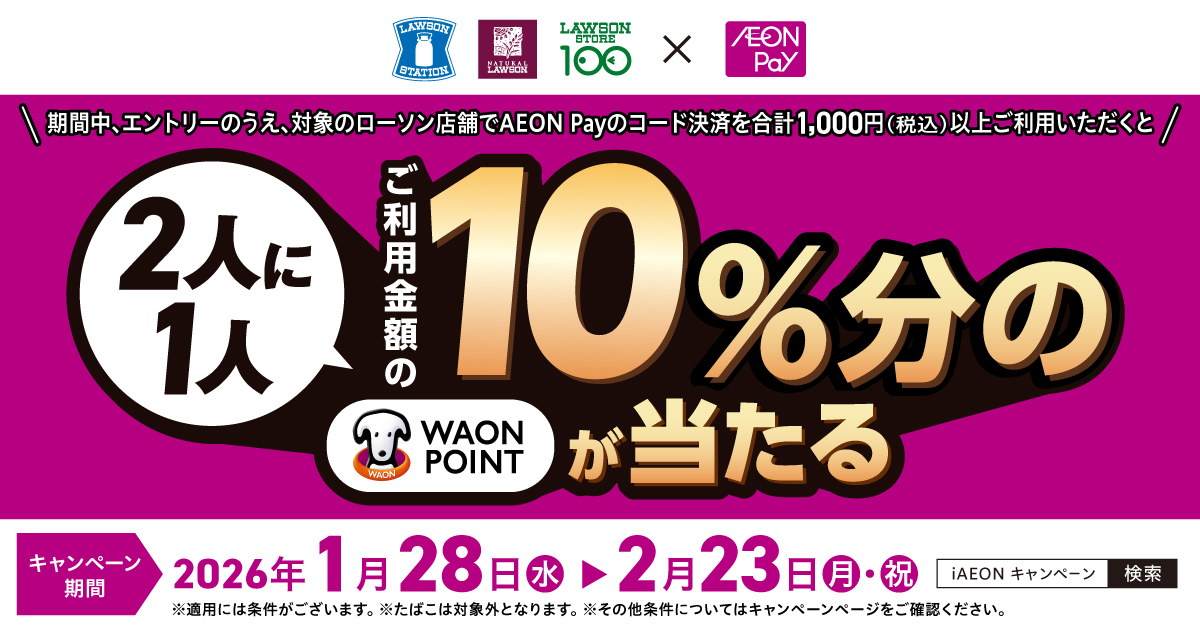 ローソンでAEON Payのコード決済を合計1,000円(税込)以上ご利用いただくと、抽選で2人に1人ご利用金額の10%分のWAON POINTが当たるキャンペーンを開催中!