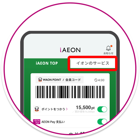 TOP画面の「イオンのサービス」タブからイオンのサービスページに入れます。