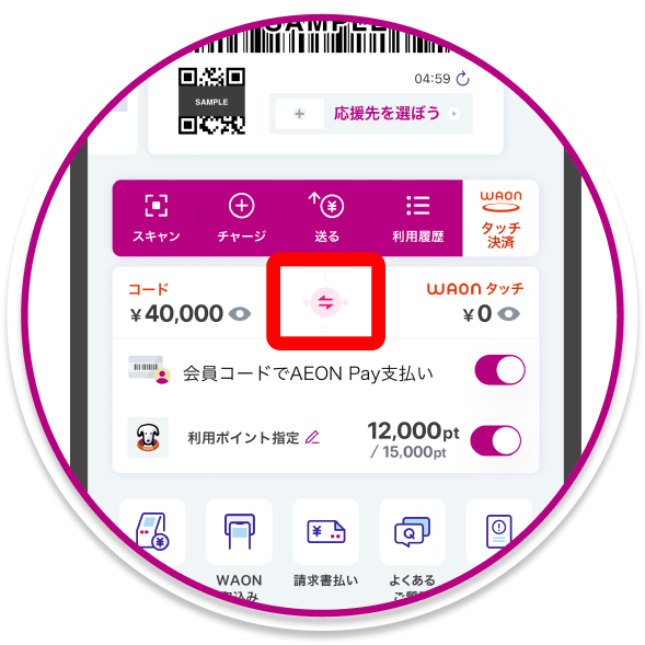 チャージ残高の表示方法が変わりました。コード決済の残高とWAONタッチの残高は自由に移動できます。