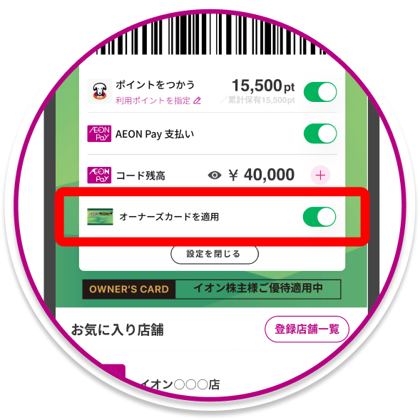 既存会員コード同様、設定からオーナーズカード適用のON/OFFができます。