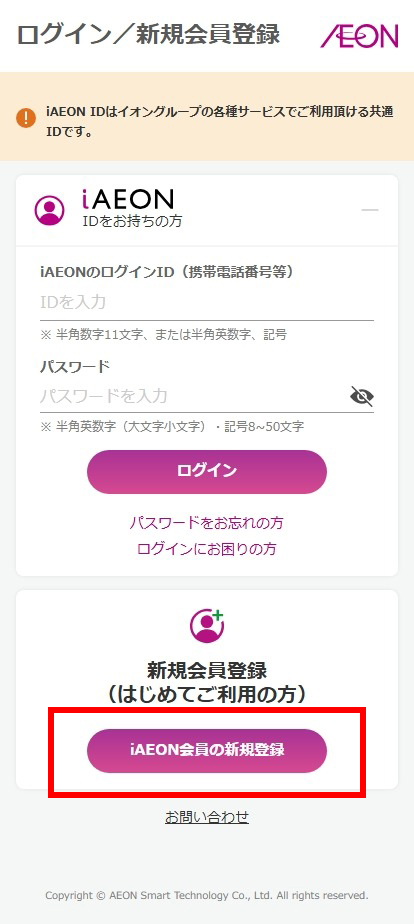 ログインページ内の「新規会員登録(はじめてご利用の方)」より「iAEON IDの新規作成」をタップ。