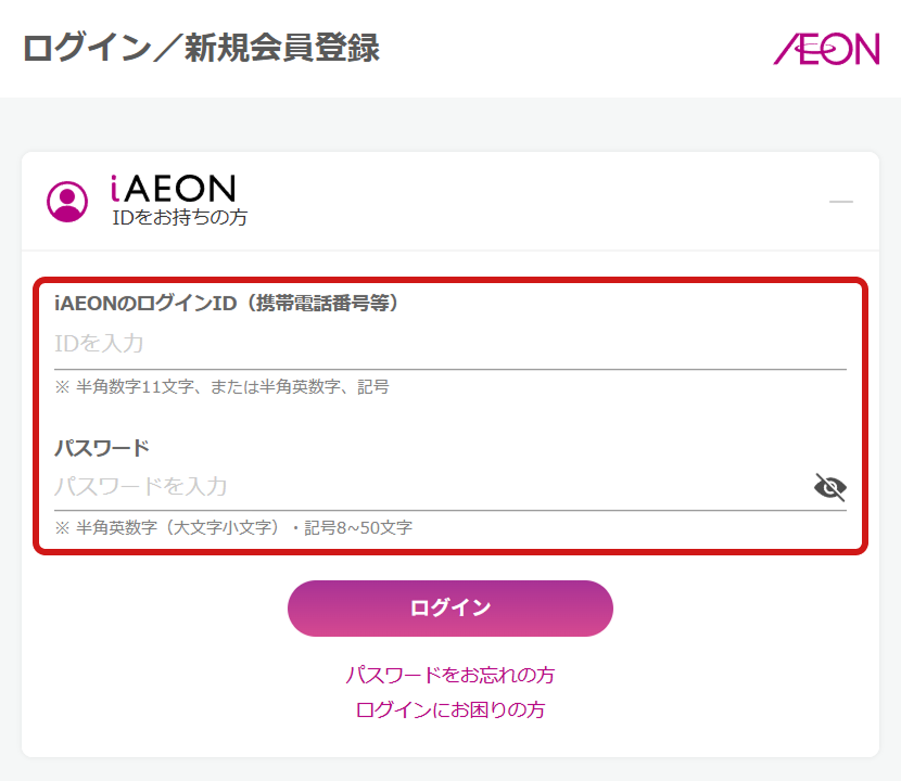 お持ちのiAEONログインIDとパスワードをご入力後、『ログイン』へとお進みください。