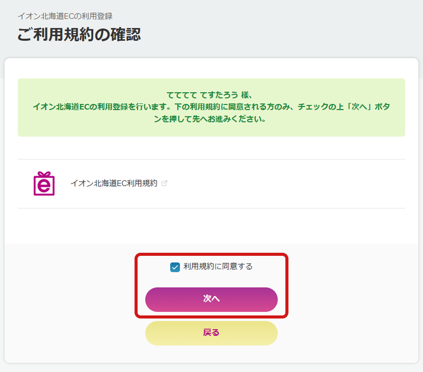 ご利用規約をご確認いただきましたら、「規約に同意する」に☑を入れて『次へ』とお進みください。