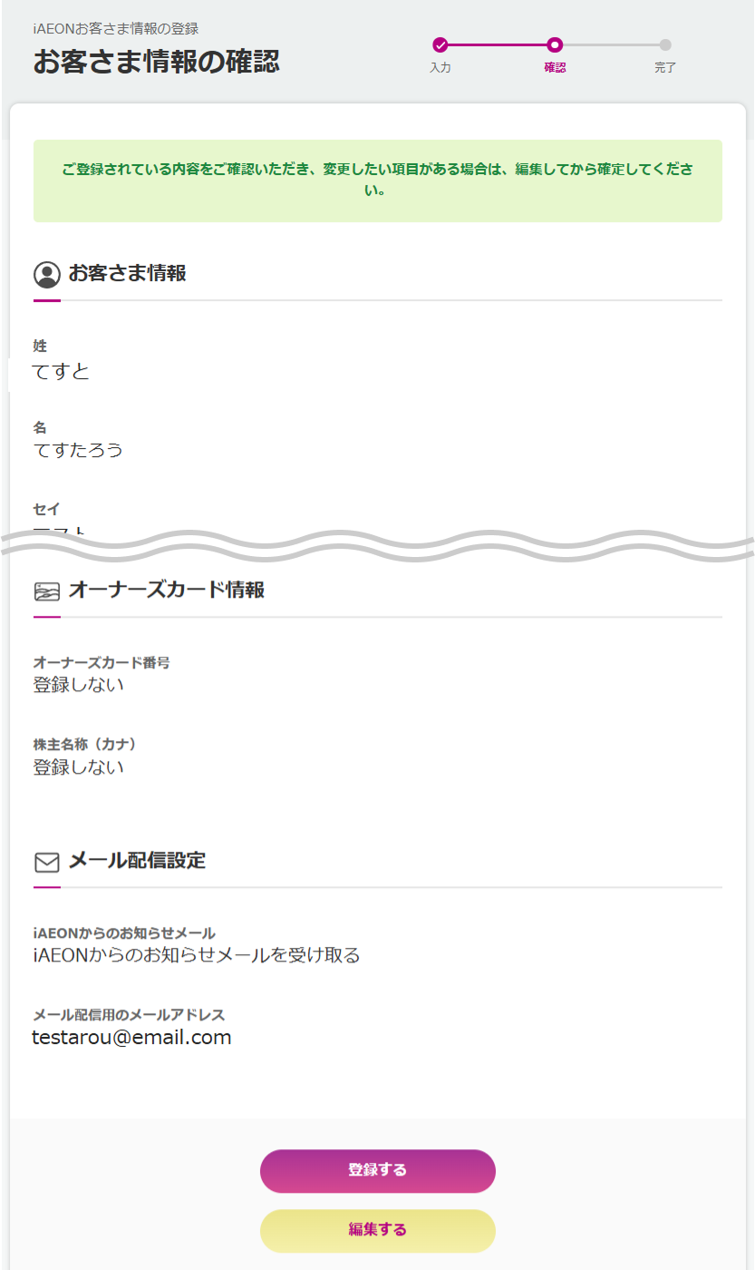 現在登録されているお客さま情報が表示されますので、内容をご確認いただき、必要があれば情報をご入力・修正し、「登録」ボタンへお進みください。