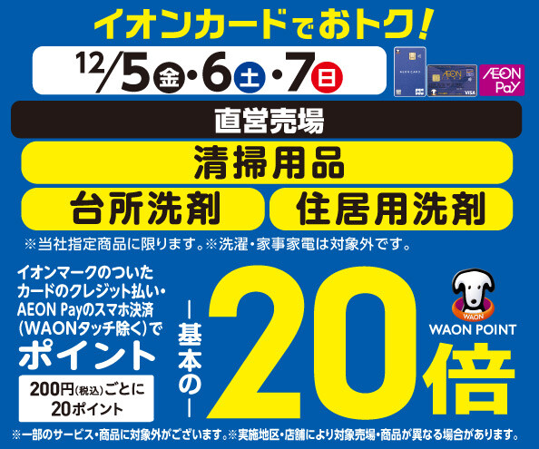 清掃用品・台所洗剤の各売場でWAON POINT基本の20倍!