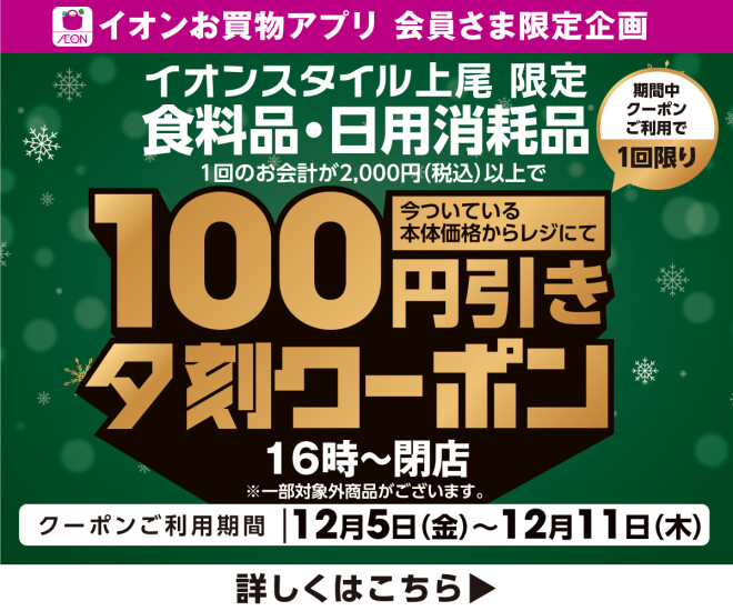 【イオンスタイル上尾限定】夕刻100円引きアプリクーポン配信!