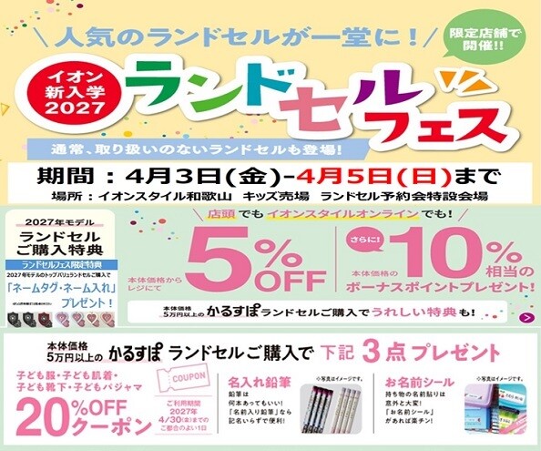 【4/3㊎~5㊐】イオンスタイル和歌山 新入学2027ランドセルフェス開催