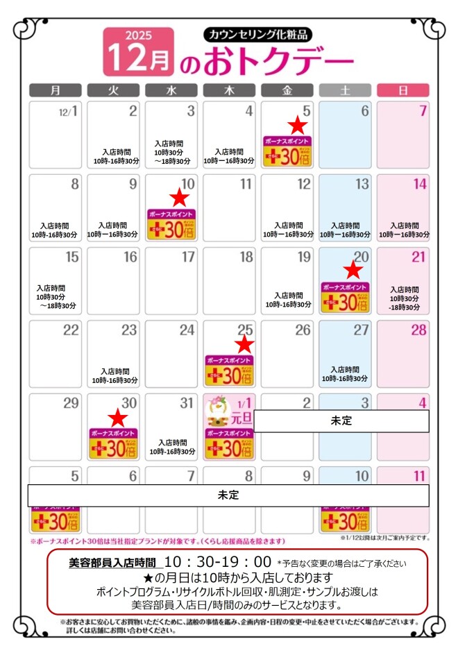 12/5日(金)、10日(水)、20日(土)、25(木)、30日(火)はボーナスポイント30倍です!!