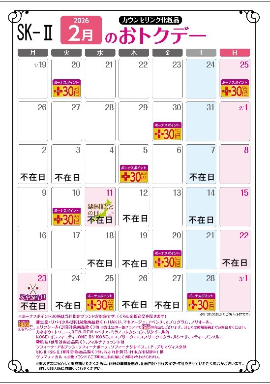 【美容部員不在日】2日(月)・3日(火)・7日(土)・11日(水)・12日(木)・14日(土)・18日(水)・19日(木)・22日(日)・23日(月)・24日(火)・26日(木)・27日(金)