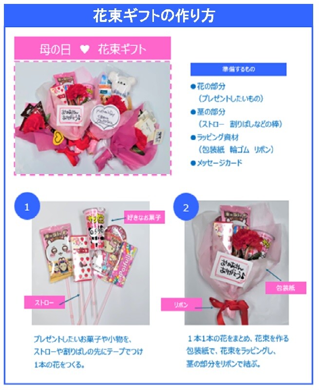 お菓子や小物を花束にして