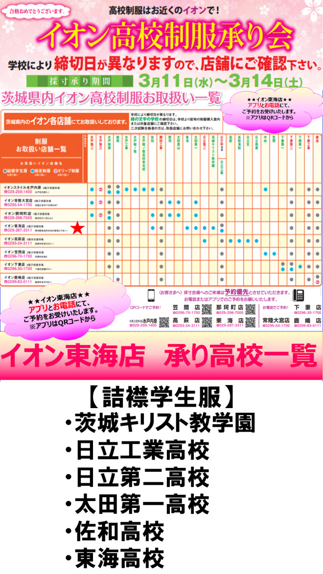 【イオン東海店 オンラインご予約システム対応高校一覧】
