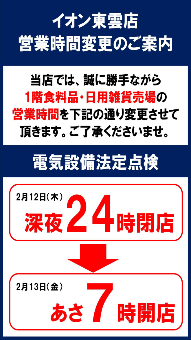 (イオン東雲店)電気設備法定点検に伴う 営業時間変更のお知らせ