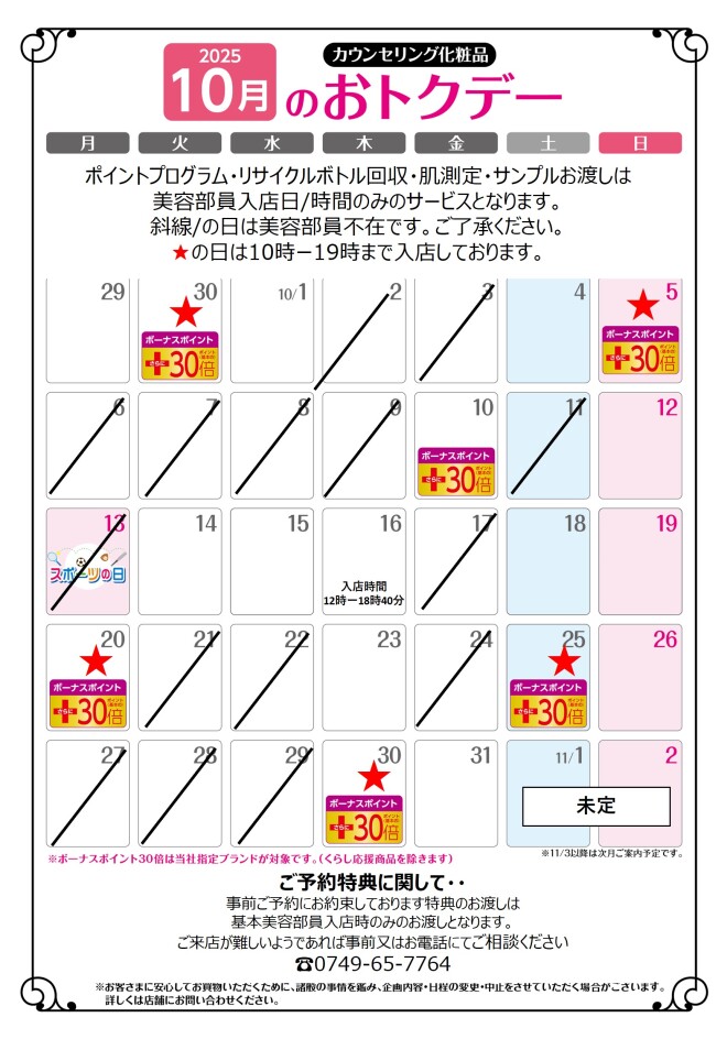※美容部員不在日 10月2日(木)、3日(金)、6日(月)~9日 (木)、11日(土)、13日(月)、