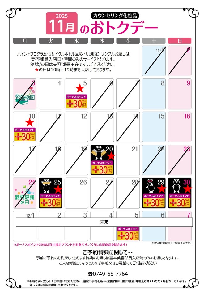 入店時間 10:00〜18:40 (詳しくはカレンダーをご覧ください) ボーナスポイントDAY★のみ19時まで