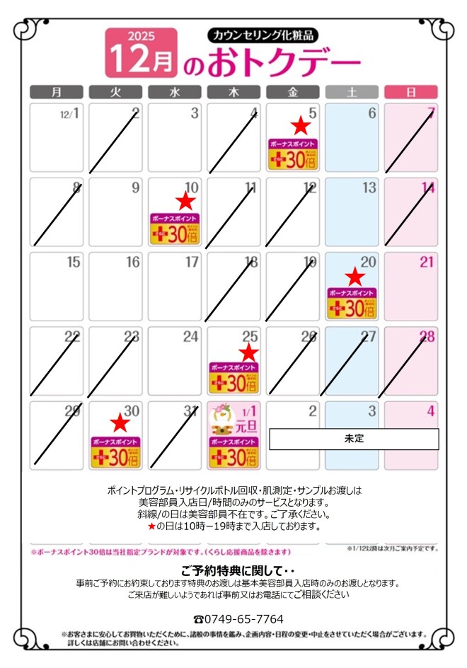 入店時間 10:00〜18:40 (詳しくはカレンダーをご覧ください) ボーナスポイントDAY★のみ19時まで