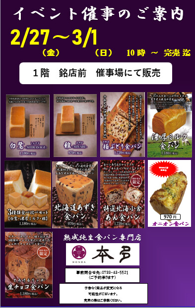 熟成純生食パン専門店「本多」催事販売のご案内