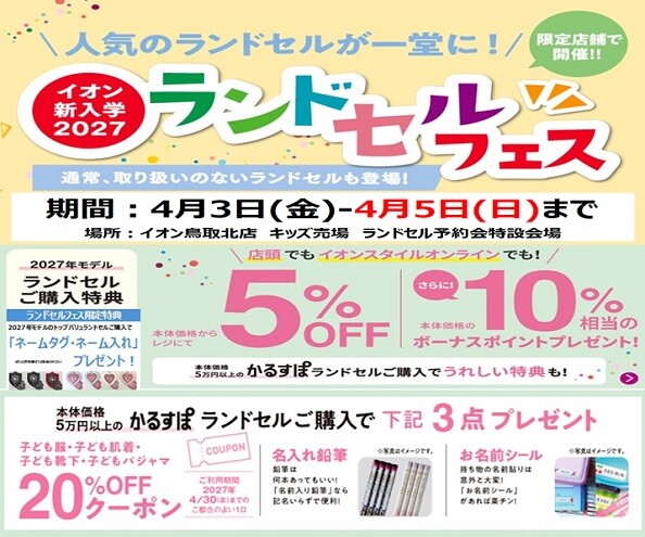 【4/3㊎~5㊐】イオン鳥取北店 新入学2027ランドセルフェス開催