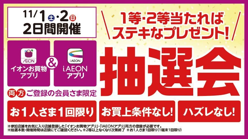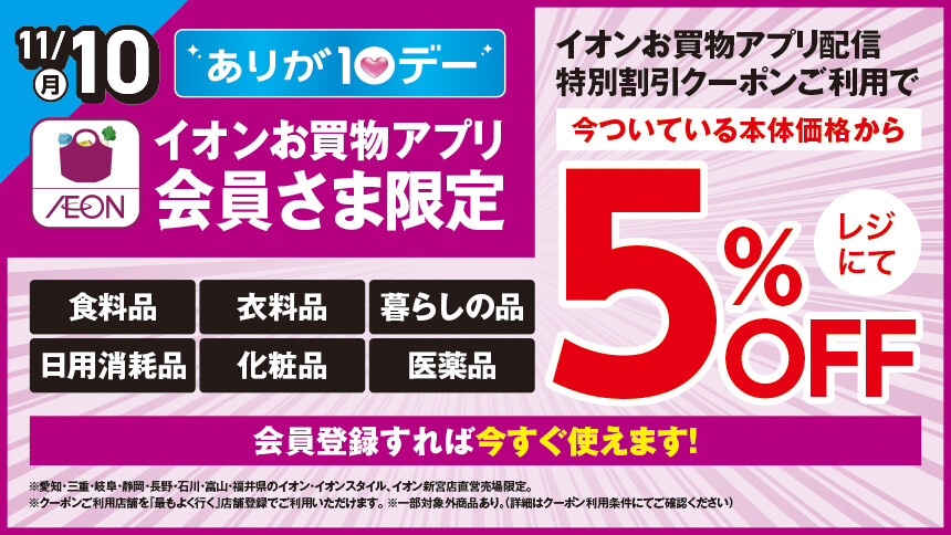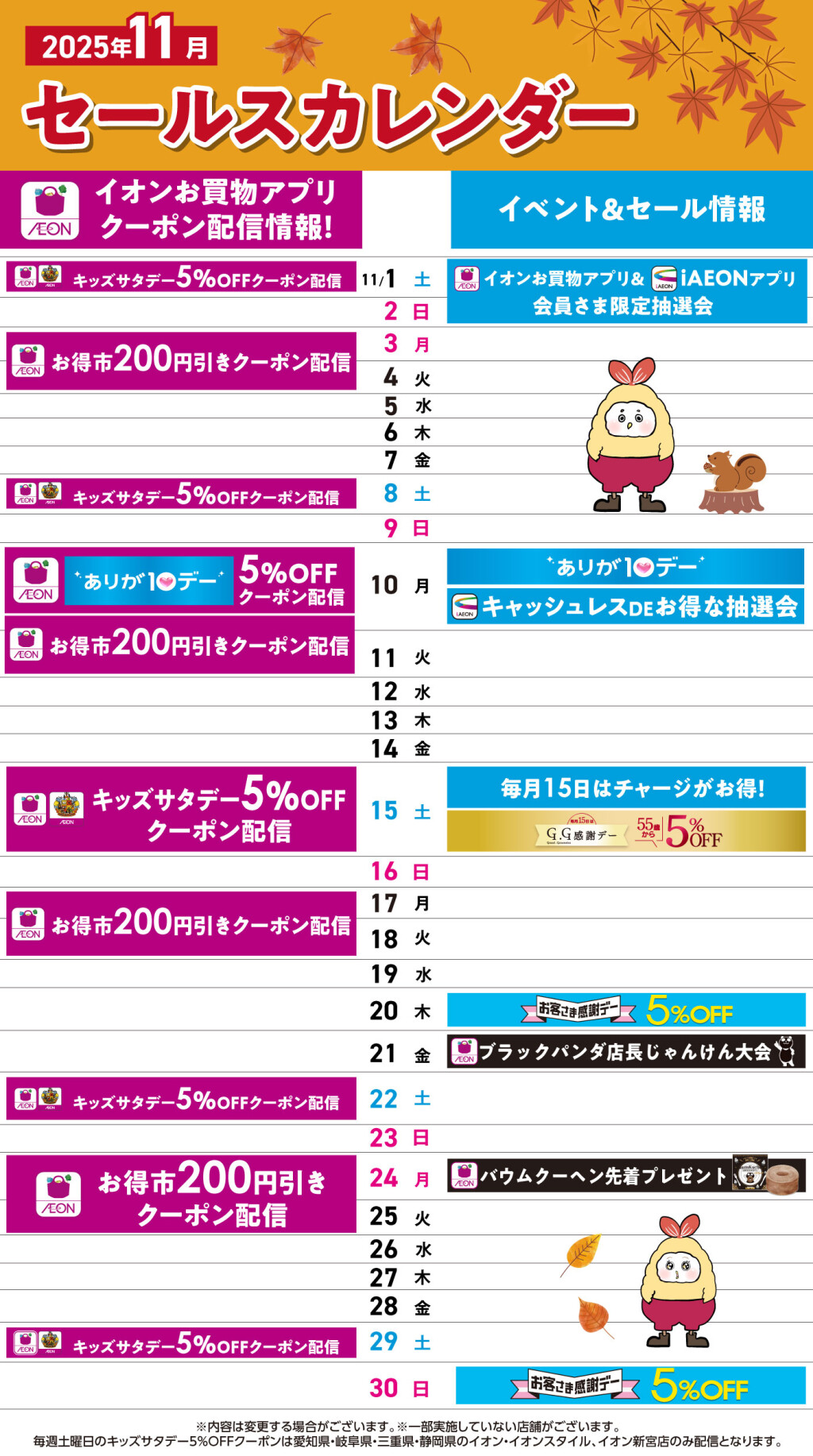 愛知・岐阜・三重・静岡・長野・石川・富山・福井県のイオン・イオンスタイル店舗とイオン新宮店限定セールス情報!※実施店舗の詳細はしばらくお待ちください。※実施店舗の詳細はしばらくお待ちください。2025/10/31現在