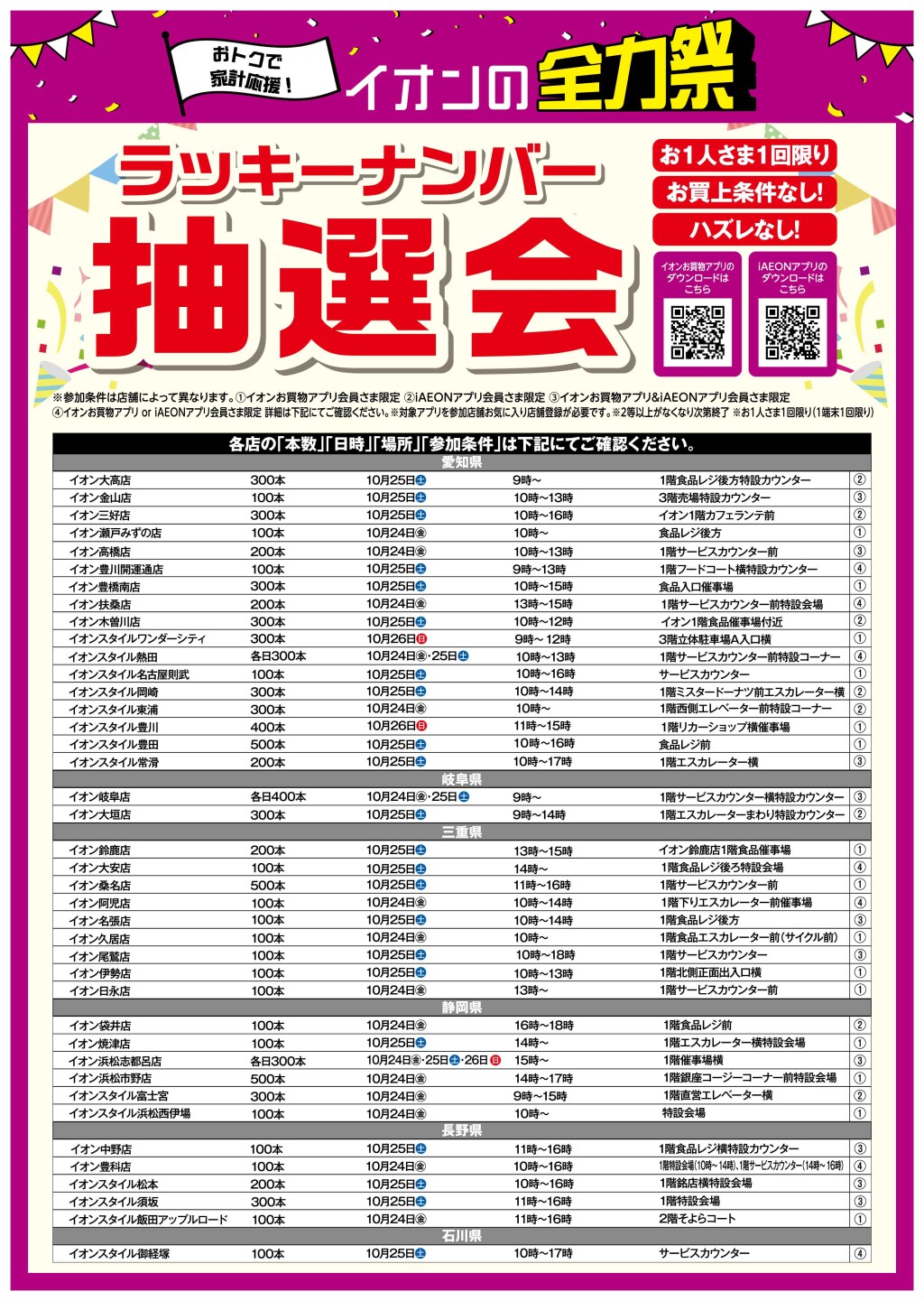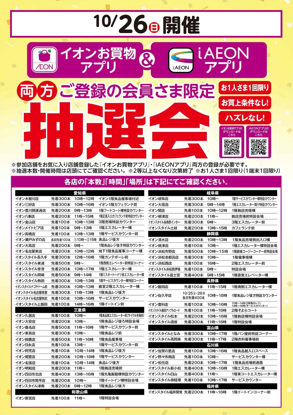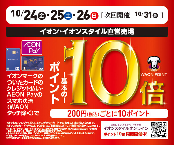 \10/24㊎・25㊏・26㊐はWAON POINTが基本の10倍!/詳しくはこちらをクリック☟イオンカードでおトク!WAON POINT基本の10倍!……………………………………………………………………………………………\抽選会 開催!/実施店舗をご確認の上、ご参加ください!