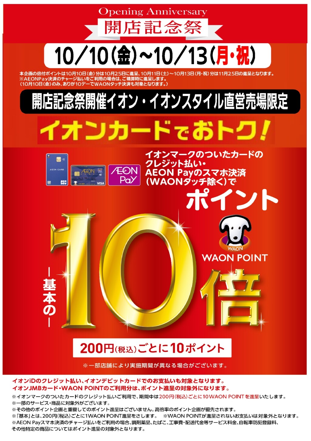【開店記念祭開催店舗限定】10/10~10/13までWAON POINT基本の10倍