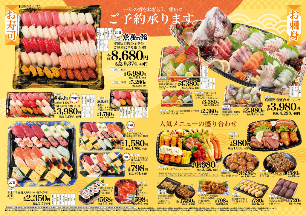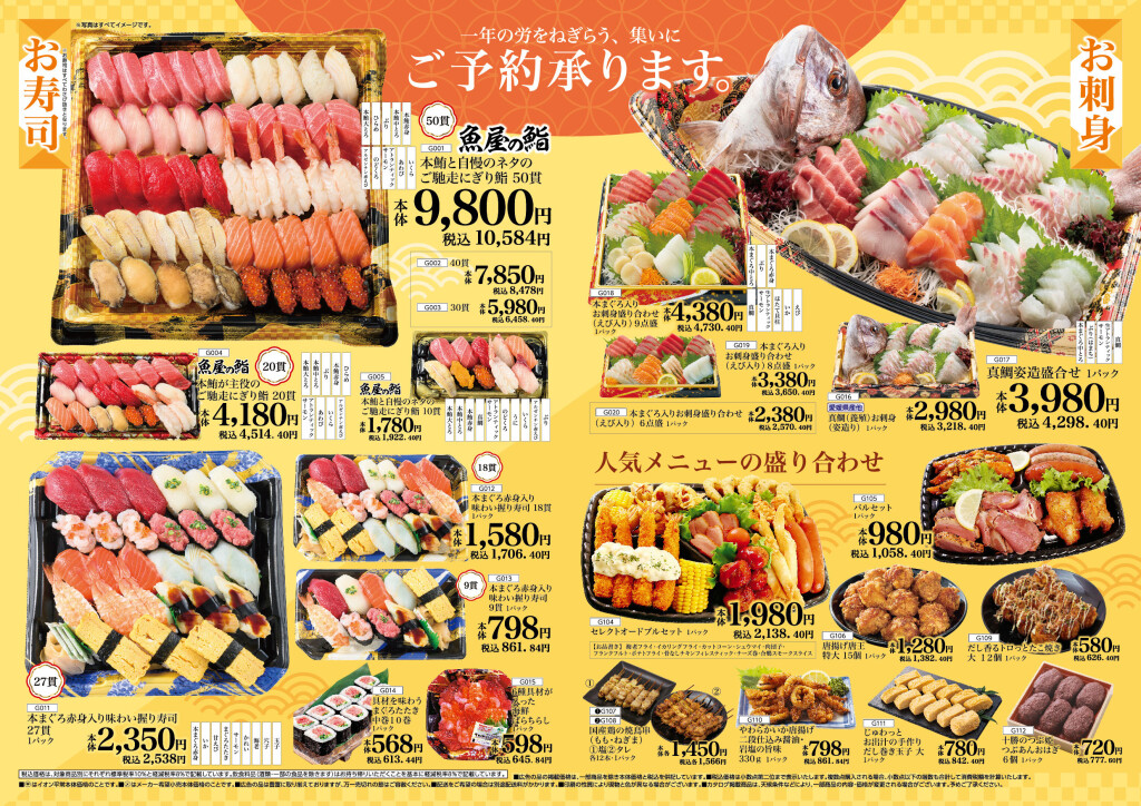 ・御用納めごちそうメニュー予約商品を1万円(税込)以上お買上げごとに、店頭で501円以上のお買い物に利用できる500円お買い物クーポン券進呈