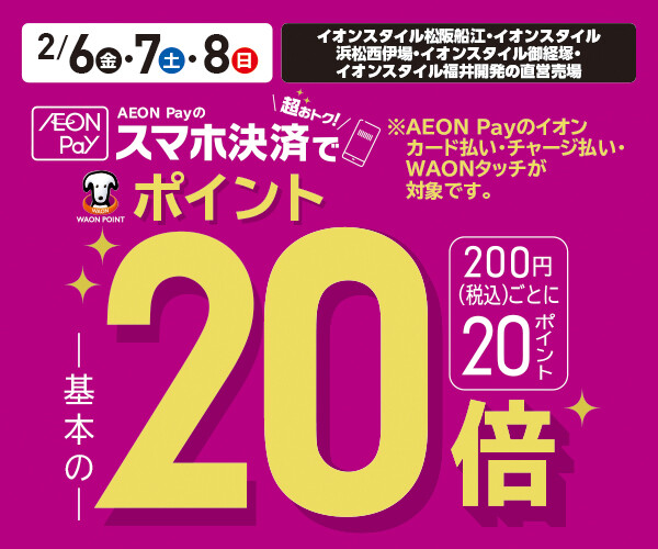 ※AEON Payのイオンカード払い・チャージ払い・WAONタッチが対象です。※Apple PayのWAON・モバイルWAONでのお支払いも対象です。※その他のポイント企画との重複進呈はございません。高倍率の企画が優先されます。※基本とは、200円(税込)ごとに1WAON POINT進呈をさします。期間中は200円(税込)ごとに20ポイント進呈いたします。※WAON POINTが進呈されないカードを登録したAEON Payのお支払いはポイント進呈の対象外です。※イオンJMBカードは対象外になります。※専門店及び、一部商品・サービスに対象外がございます。※イオンネットスーパー及びオンラインショップは対象外となります。※WAON POINTのご利用分はポイント進呈の対象外となります。※Apple Payは、Apple Inc,の商標です。