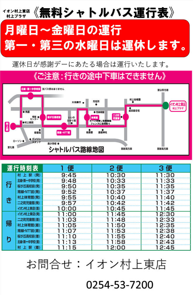 イオン村上東店正面入り口のバスのりばから二之町児童館前、村上体育館(バス停はございませんが、駐車場のフェンスに目印がございます。)