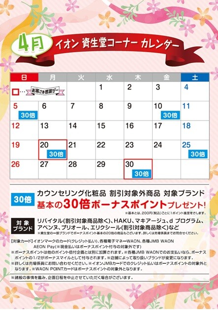 ※詳細、イオン資生堂コーナーカレンダーをご参照ください。
